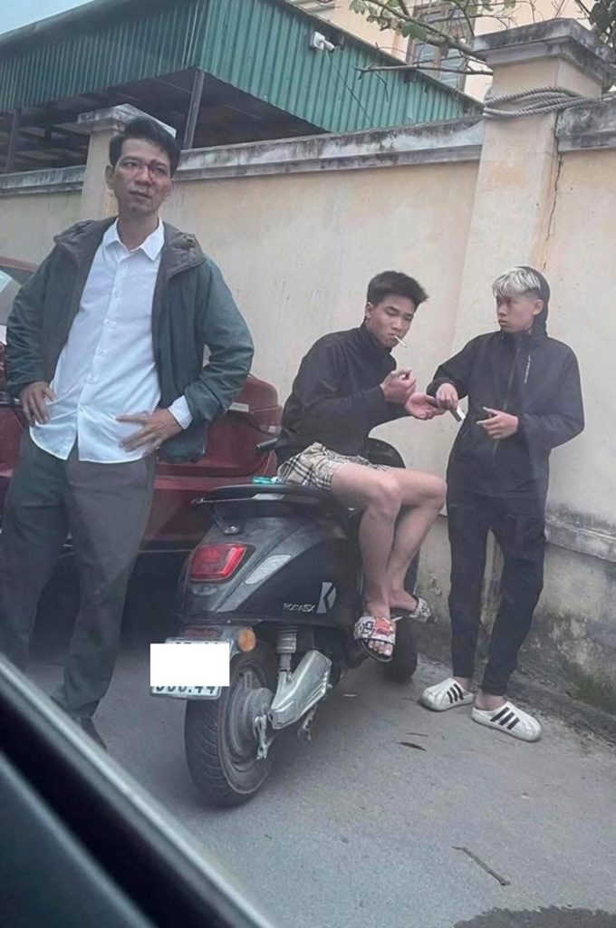 Bị đánh, ông bố bức xúc nhờ người dân gọi công an. Còn thanh niên kia cũng không bỏ chạy, thản nhiên phì phèo điếu thuốc chờ lên làm việc.